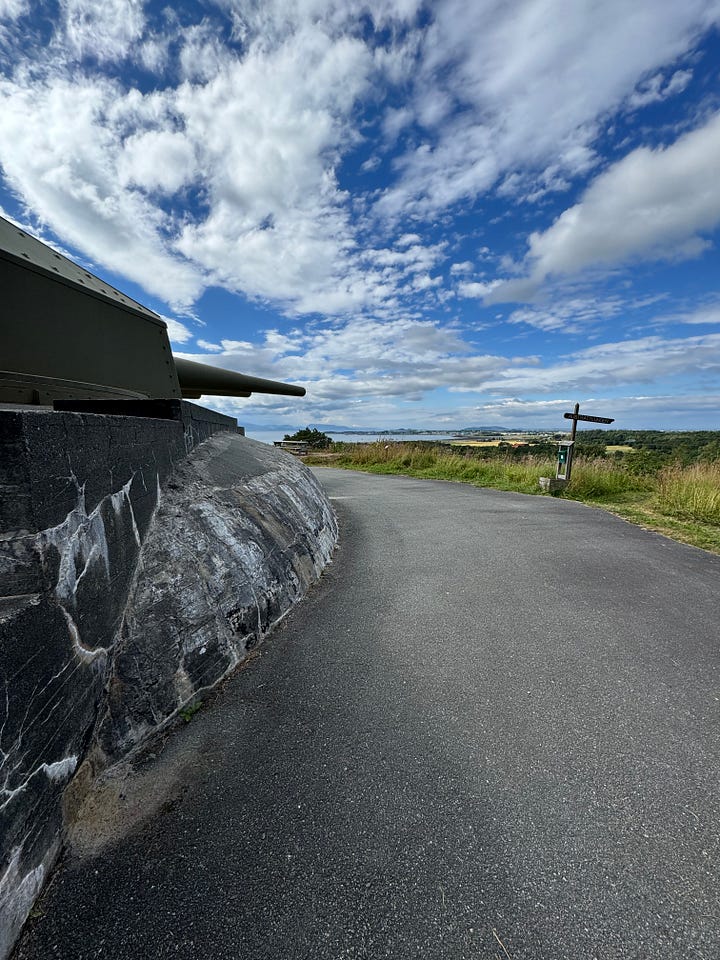 Scattered throughout our small town in Norway are remnants of the past. There’s a castle from the middle ages, a historical fishing harbor, a burial mound from the Iron Age, and numerous bunkers, shelters, and lookout spots from World War II (WWII). We’ve done some self-guided tours and hikes to these various locations over the time we’ve lived here, but a couple of weeks ago we took a guided tour of Austrått fort, a five-story cannon tower utilized during WWII.